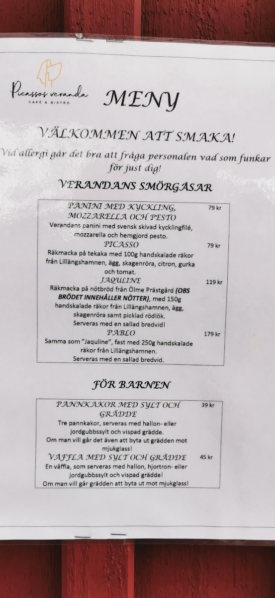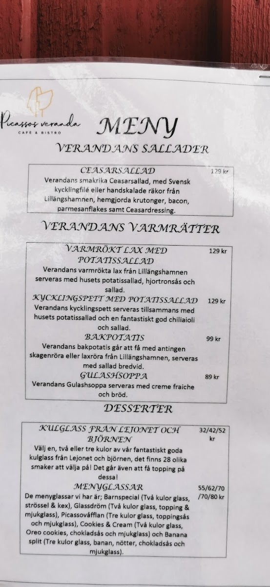 Picassos Veranda Cafe och Bistro Menu